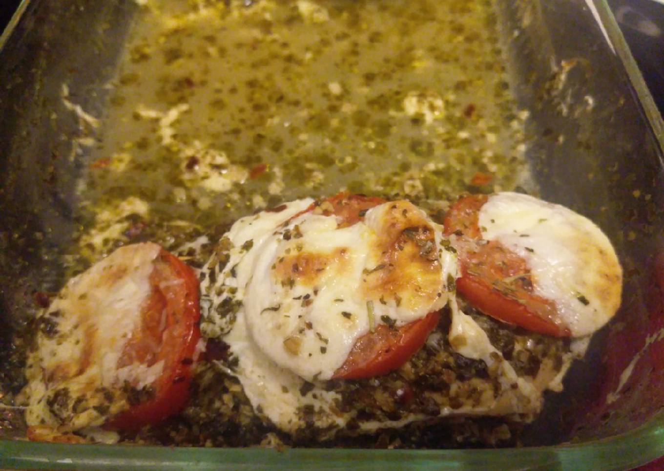 - Add your tomato on top of your peston and then place your mozzarella cheese on top. Sprinkle with a dash of pepper and some parmesan,and Italian Season. Bake at the 400°F (200°C) for 35- 40 mins until chicken is cooked internally to 170°F and cheese should be bubbly and lightly browned.You are done,served fresh with salad or other sides dish. Enjoy!! I ran out of cheese so use as much as you like on yours.