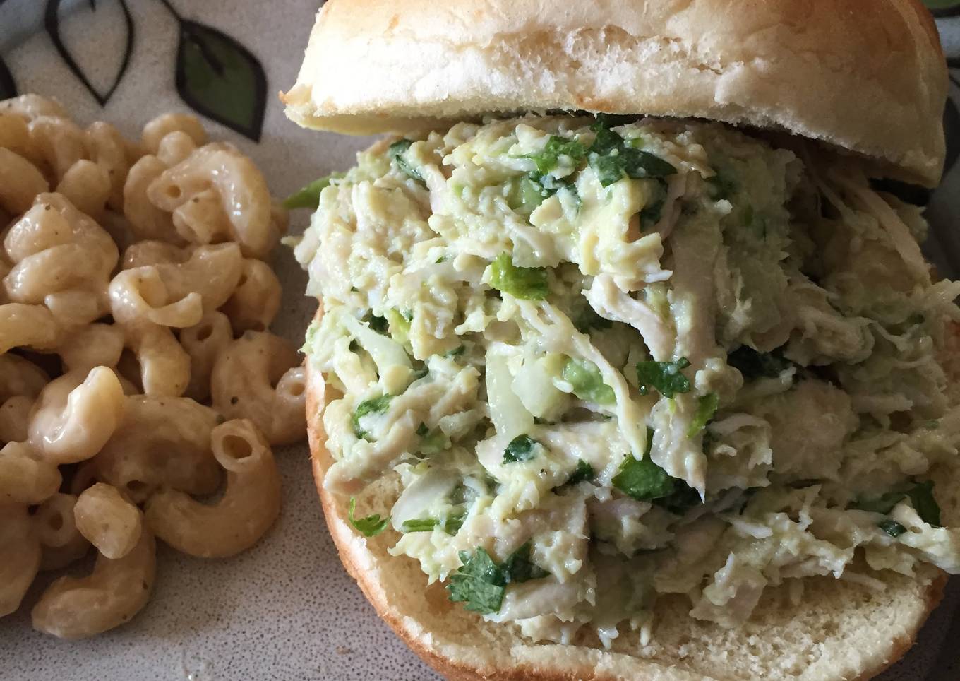 - Mix all together. I leave some of the avocado in small pieces. Make sure chicken isn't chunky most of the avocado is mixed... If you want more creamy add more avocado. Can garnish with sliced avocado