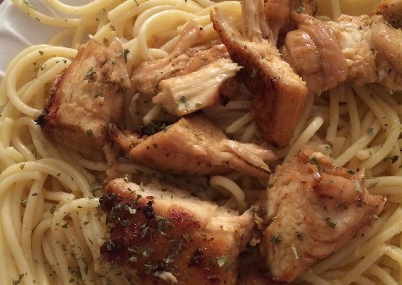 - For spaghetti, boil based on package directions. In a pan place butter garlic salt and pepper. Once butter melted add noodles and toss. Place chicken and sauce on top. Sprinkle with parsley