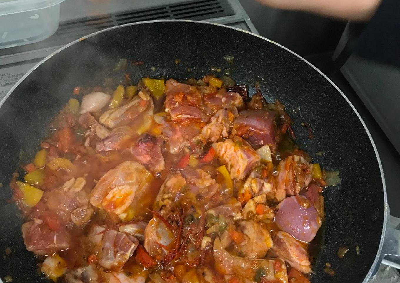- One portion for chicken we add the tomatoes. Stir until it's a thick paste.then add the chicken and stir until all parts are well coated.Add 1/2cup of water to allow the spices to blend into chicken.let it boil and water evaporate until the soup is thickened.